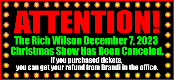 December 7, 2023 Christmas Show Has Been Canceled Published on November 29, 2023 by corvettes The Rich Wilson December 7, 2023 Christmas Show Has Been Canceled. If you purchased tickets, you can get your refund from Brandi in the office. COMING SOON!!!