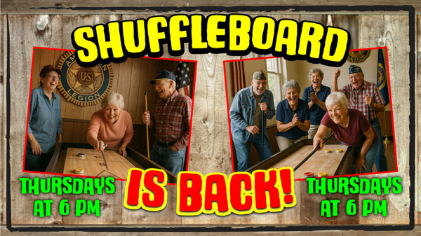 Tuesdays – Chips Ahoy @ 1 PM; Eucher @ 1 PM; CORNHOLE GAMES @ 6:30 PM; & SONs BINGO @ 6:30 PM.