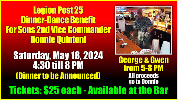 This Saturday; May 18, 2024 Post 25 Benefit for Donnie Quintoni Dinner-Dance.