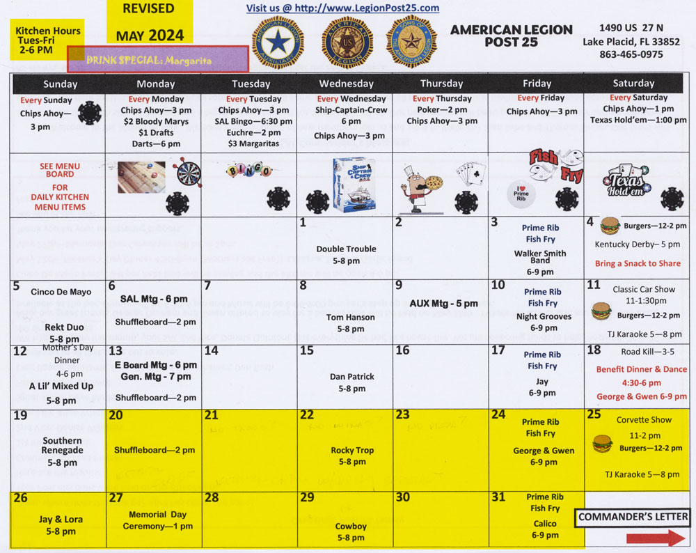 Saturday, May 25, 2025 – Chips A’Hoy and Texas Hold’em at 1 pm. Burgers and hotdogs on the grill from 12 Noon to 2 pm. Highlands County Corvettes Car Show, 11 AM to 2 PM. TJ Karaoke from 5-8 PM.
