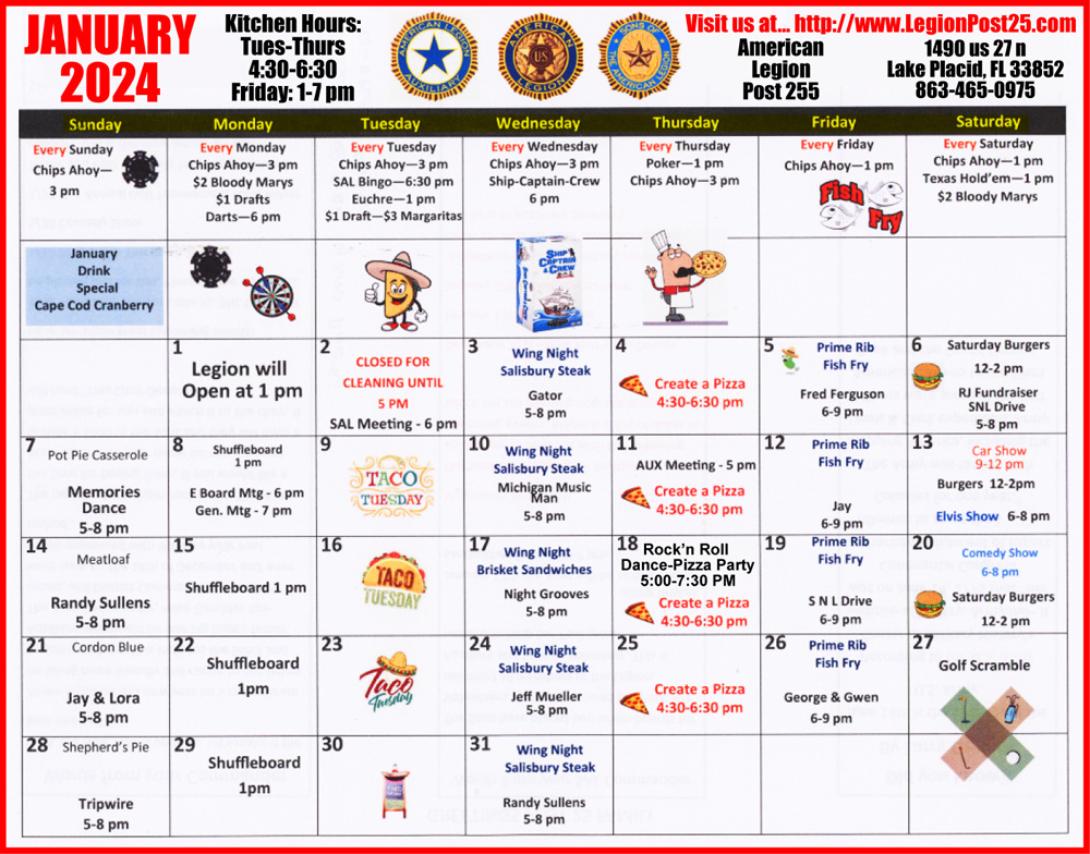 Second, we’ll have some changes and additions to our food schedule! Details coming up next and the January entertainment schedule to follow.