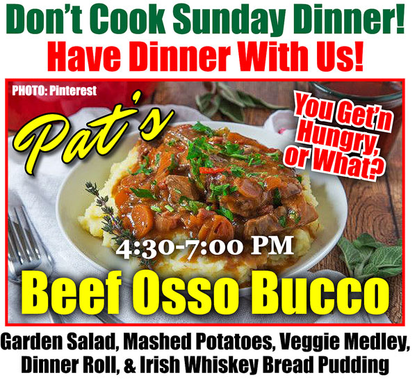 Monday, October 7, 2024 – THE EARLY BIRD DINNER HAS BEEN CANCELED. Happy Hour 3-5 PM.Shuffleboard starting at 2 PM. Chips Ahoy starting at 3 PM. Darts at 6 PM. October SONs Meeting, at 6 PM.